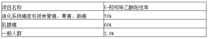 5-羥吲哚乙酸是腫瘤發(fā)病過程中的人體氨基酸異常代謝產(chǎn)物之一。本試劑用于食管癌、胃癌、腸癌、乳腺癌的輔助診斷。消化系統(tǒng)由幽門螺旋桿菌感染引起的胃潰瘍、胃炎、乳腺系統(tǒng)炎癥、嗜鉻細胞瘤、急性闌尾炎、酒精過敏體質(zhì)酒后近期都會引起的人體應(yīng)激反應(yīng),這些應(yīng)激反應(yīng)導(dǎo)致體內(nèi)的氨基酸代謝異常,使得晨尿中5-羥吲哚乙酸的含量遠遠超過正常人。本試劑通過與5-羥吲哚乙酸發(fā)生特征顯色反應(yīng),即可判定被測試者體內(nèi)是否有相關(guān)的異常代謝。